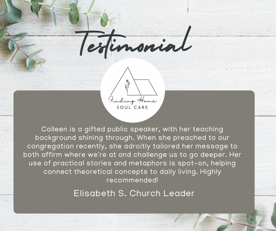 I also love to share soul care with larger audiences. I am a speaker, teacher, and Author. I would love to come and share the message with your group and/or church. Check out how